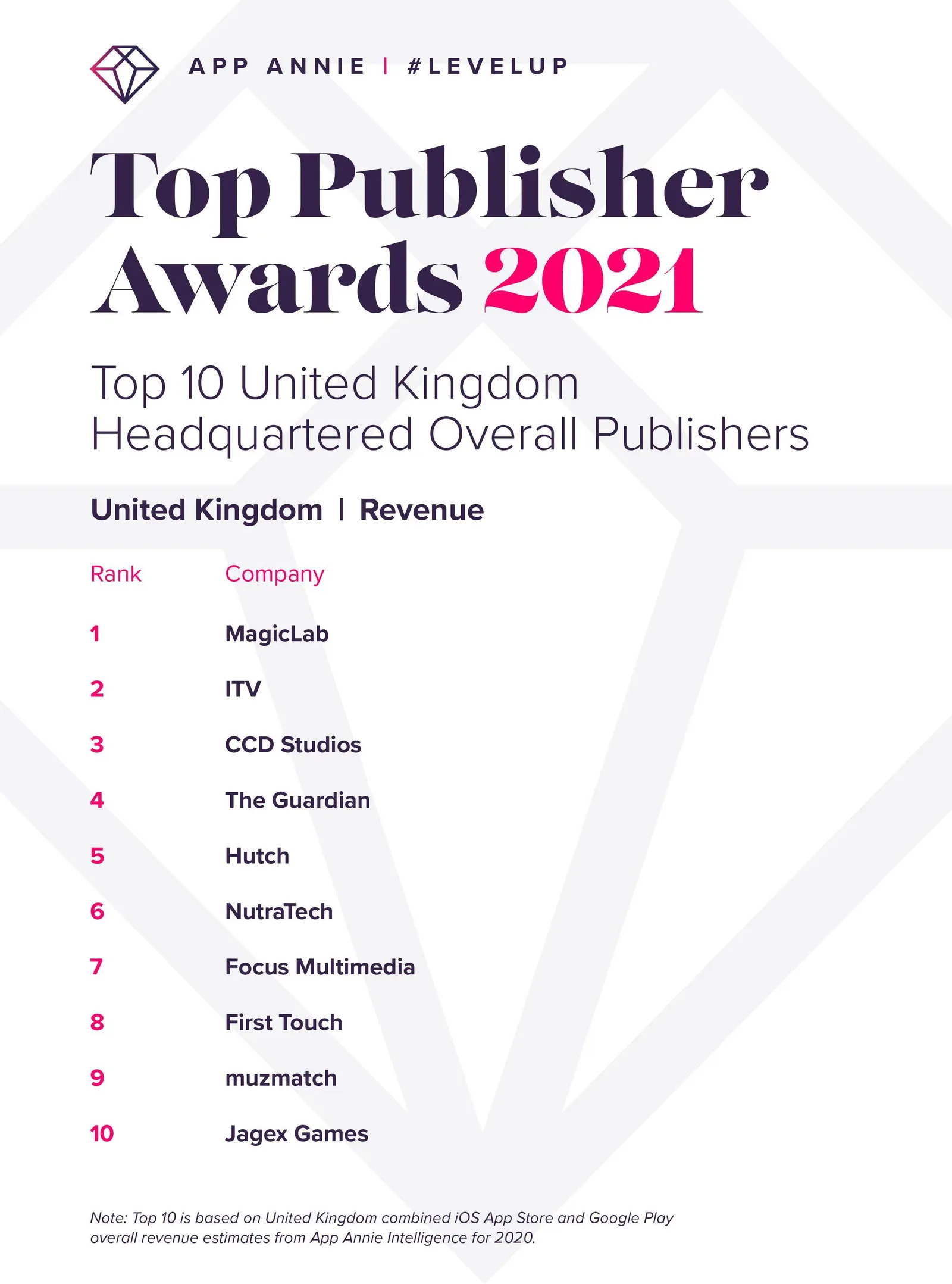 Every year App Annie recognizes the most innovative and successful companies on mobile from around the world. And this year we’re proud to announce that Hutch made it into the Top 10 UK publishers by revenue. We came in at no. 5, which is 2 spots higher than last year!