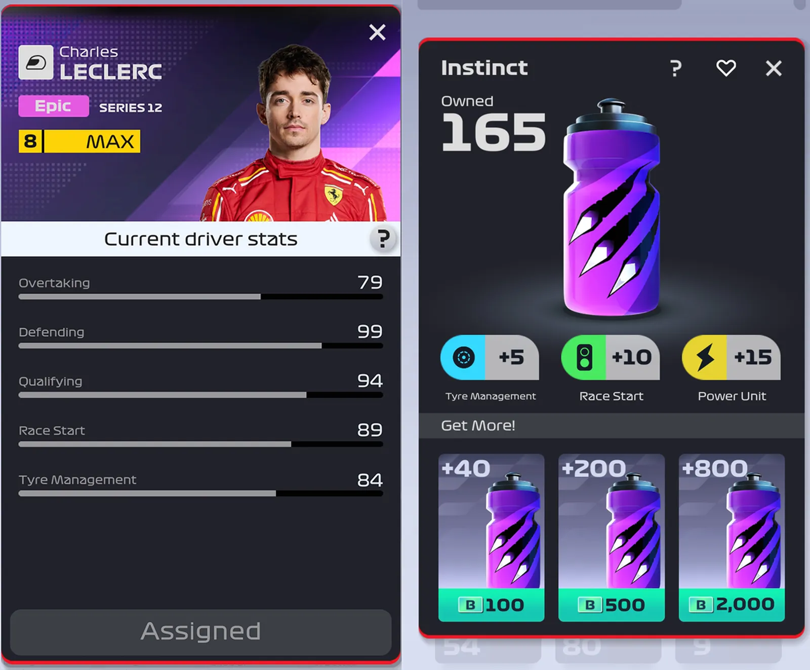 Using Level 8 Epic Charles Leclerc as an example: This Driver’s Race Start stat is 89. If this Asset received a 10% stat increase bonus during a Grand Prix Event, Players will be able to see this stat increase by 9 (8.9% increase rounded to 9), for a total Race Start value of 98.