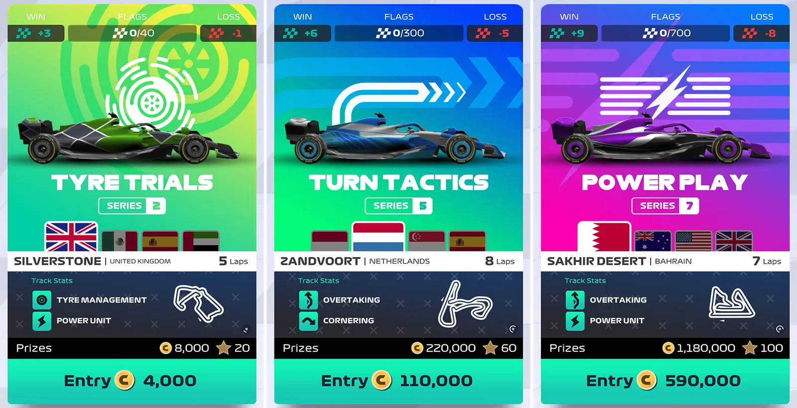 For Duels; each Series will focus around 1 specific Track Stat (eg: Series 5 features Cornering as one of the Track Stats on every track) while the second Track Stat will be determined by the specific track itself. In regards to Grand Prix’s; Tracks will feature the same Track Stats as in Duels, but since Grand Prix race tracks are known in advance, it's possible to focus on both the Driver and Component stats with the highest impact. Allowing Players to strategise on the best possible loadout before each, individual race.:format(webp)/f/138645/1800x923/892c3d03f0/f1-2024-seriescards.png)