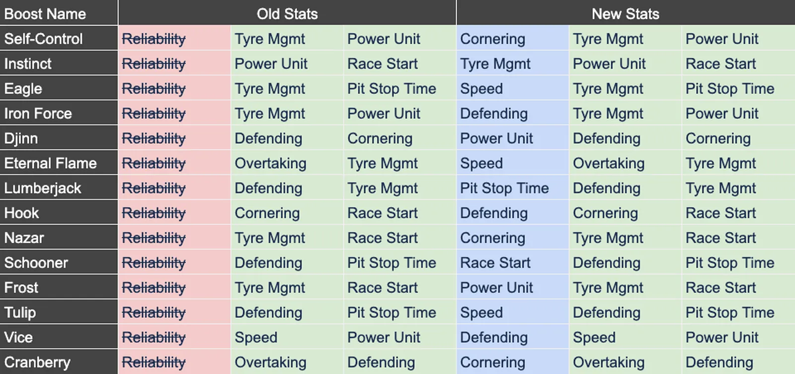 Due to the removal of Reliability; this results in some Boosts which improved this stat to be updated. We’re aware of Players investment and existing collections of Boosts so have carefully updated only those Boosts which previously had an effect on Reliability. Instead of shuffling all of the affected stats for these Boosts, only the Reliability effect has been replaced with an existing stat. See the table below providing a guide on which Boosts are being updated and what new stat they will be improving.:format(webp)/f/138645/959x451/03e9259403/f1-2024-boostchanges.png)