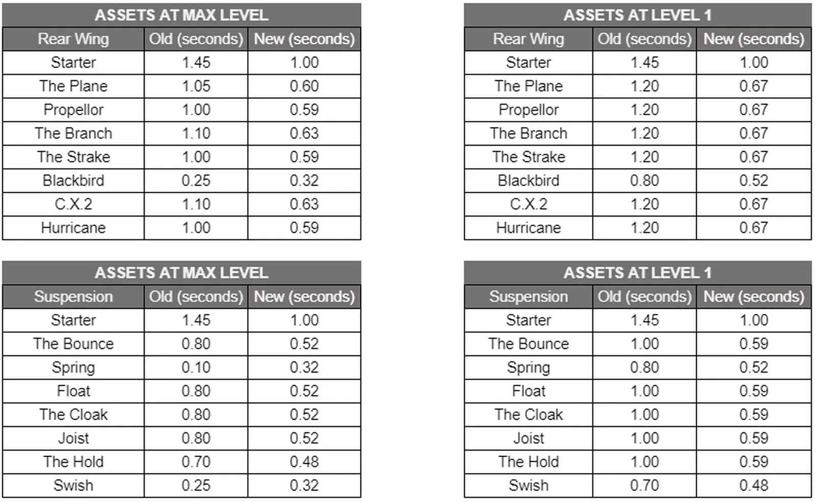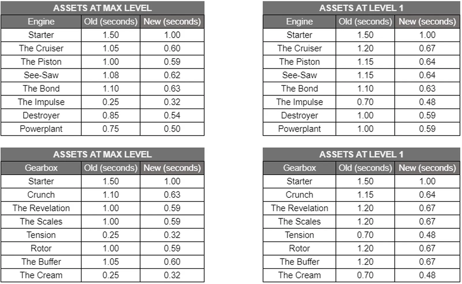 Finally, here are some tables to show you how pitstop times for all components will be affected at both lvl 1 and also at max level so you can plan your loadouts once these balancing changes have been made.