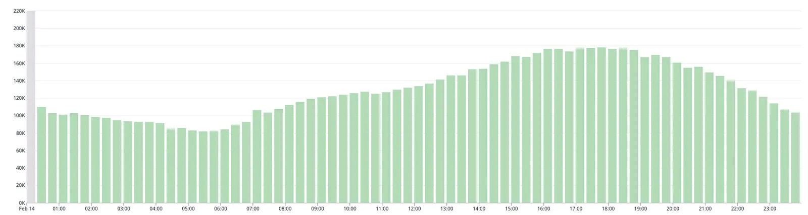 It follows a fairly typical sinusoidal wave with the peak in the evening hours when people are at home after work, and the trough in the early hours of the morning when people are asleep. Traffic increases and decreases gradually over the time period. This is a perfect fit for monitoring CPU usage. At Hutch, we try to keep our servers running between 45-55% CPU usage which means we aren’t wasting CPU, but the servers have headroom to deal with load increasing in the time it takes new servers to come on line and provide extra capacity.