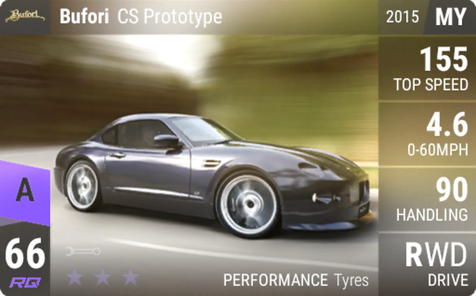 The CS Prototype is Bufori’s take on the rear-wheel drive performance coupe. It boasts a powerful 330bhp performance engine and excellent handling to make it a strong performing Epic in both drag races and twisty circuits.