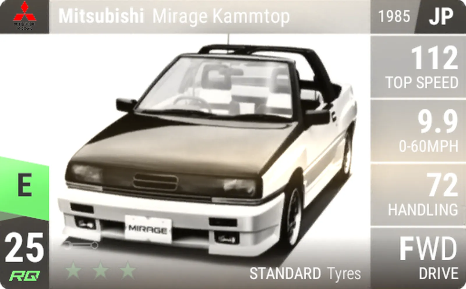 The Mitsubishi Mirage Kammtop convertible is a capable Uncommon with decent performance and good handling. It also boasts retro 1980’s flared bodywork giving it unique looks.