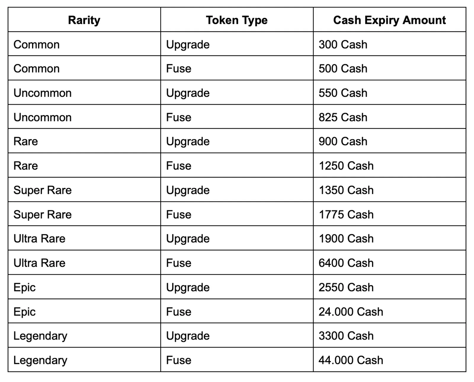 Tokens that expire will award a defined amount of cash. The value depends on the token’s rarity and if it’s an upgrade or fuse token.