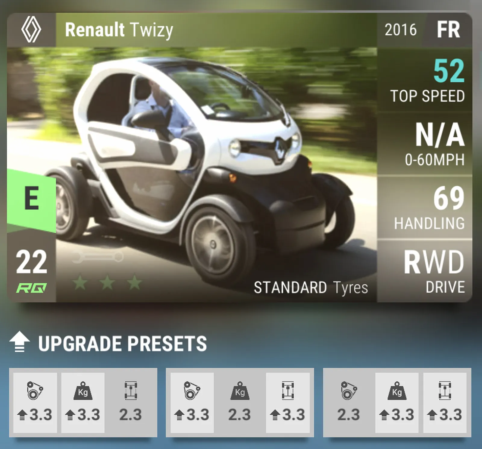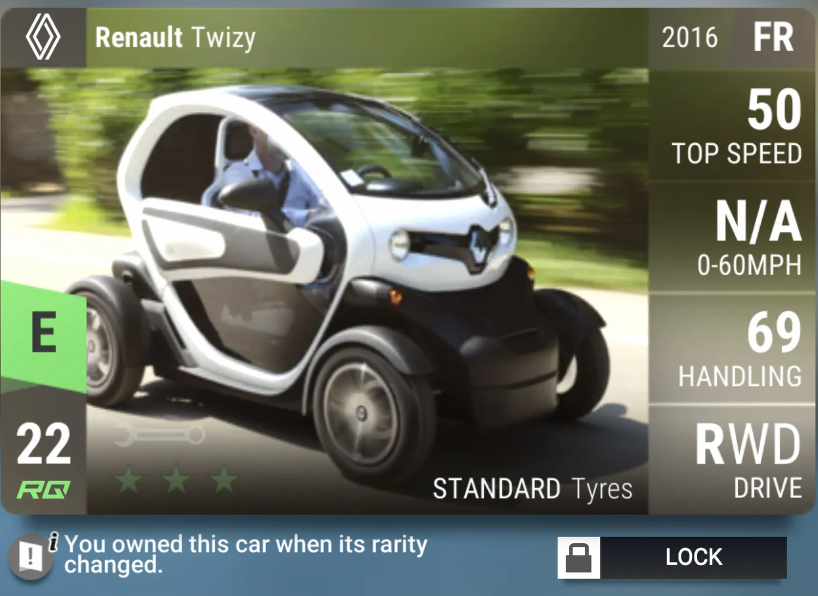 In the example above, the Twizy was originally a Common car (as indicated by the gray icon) but has been reclassified as Uncommon. If you sell this car, you will receive cash equivalent to its previous Common rarity.